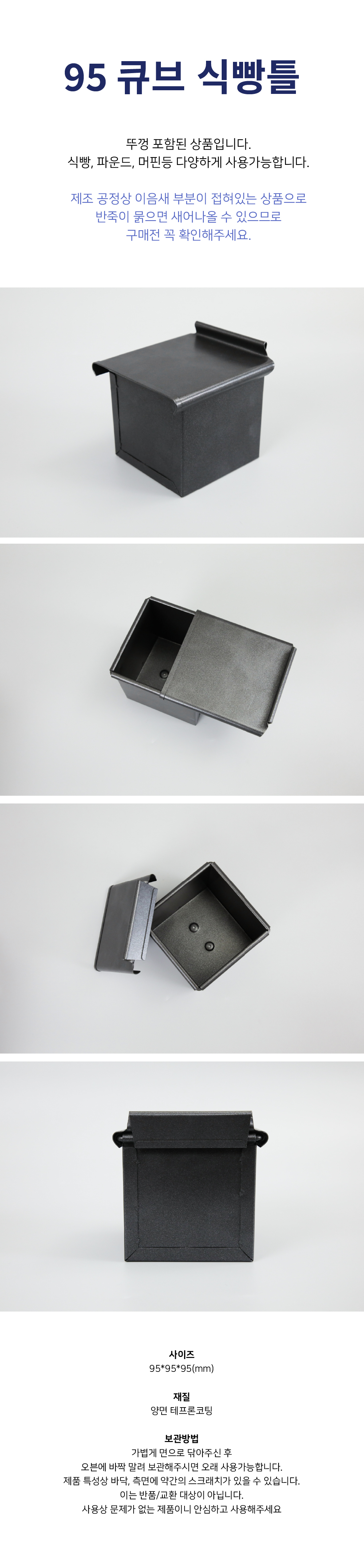 방백마켓 큐브식빵틀의 사이즈는 1. 가로70mm x 세로70mm x 높이70mm 2. 가로95mm x 세로95mm x 높이95mm 2가지가 준비되어있습니다. -베이킹팬 구매 시 주의사항-1. 제품을 구입하기 전에 오븐의 안쪽 크기를 확인하세요. 2. 반드시 세척 후 사용해 주세요. 3. 제품 사용 후 부드러운 천으로 닦아 보관해 주세요. 4. 날카로운 도구 등으로 코팅이 벗겨지지 않도록 주의해 주십시오. 5. 제조공정 특성상 모래알, 연마흔적 또는 스크래치가 있을 수 있습니다. 불량이 아니므로 안심하고 사용하십시오. 방백마켓에서는 큐브 식빵틀 외에도 다양한 베이킹 도구가 준비되어 있습니다. 방백마켓은 온라인과 오프런니에서 구매 가능하며, 카카오톡 상담도 가능합니다! 온라인↓ 방백마켓 큐브식빵틀의 사이즈는 1. 가로70mm x 세로70mm x 높이70mm 2. 가로95mm x 세로95mm x 높이95mm 2가지가 준비되어있습니다. -베이킹팬 구매 시 주의사항-1. 제품을 구입하기 전에 오븐의 안쪽 크기를 확인하세요. 2. 반드시 세척 후 사용해 주세요. 3. 제품 사용 후 부드러운 천으로 닦아 보관해 주세요. 4. 날카로운 도구 등으로 코팅이 벗겨지지 않도록 주의해 주십시오. 5. 제조공정 특성상 모래알, 연마흔적 또는 스크래치가 있을 수 있습니다. 불량이 아니므로 안심하고 사용하십시오. 방백마켓에서는 큐브 식빵틀 외에도 다양한 베이킹 도구가 준비되어 있습니다. 방백마켓은 온라인과 오프런니에서 구매 가능하며, 카카오톡 상담도 가능합니다! 온라인↓